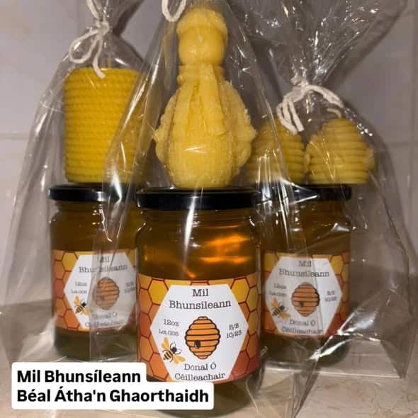 Beachairí Dónal agus Gearóid Ó Céilleacháir ag díol coinnle meala agus céir bheach áitiúla